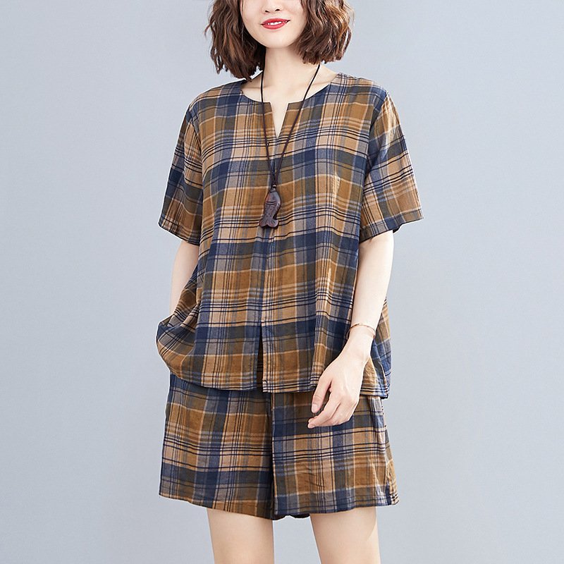 ชุดเสื้อกางเกงสั้นผู้หญิง พิมพ์ลายสก๊อต เซต 2 ชิ้น